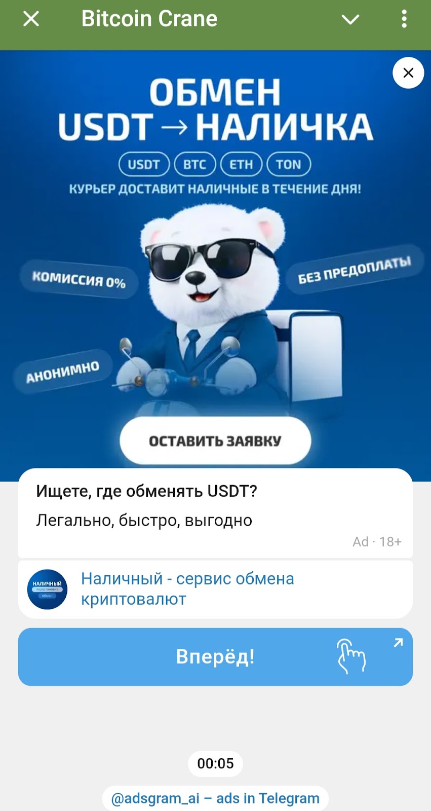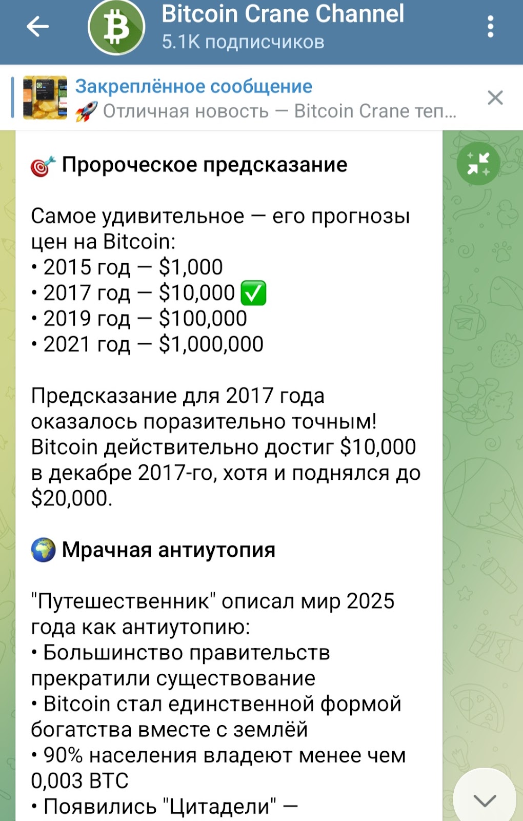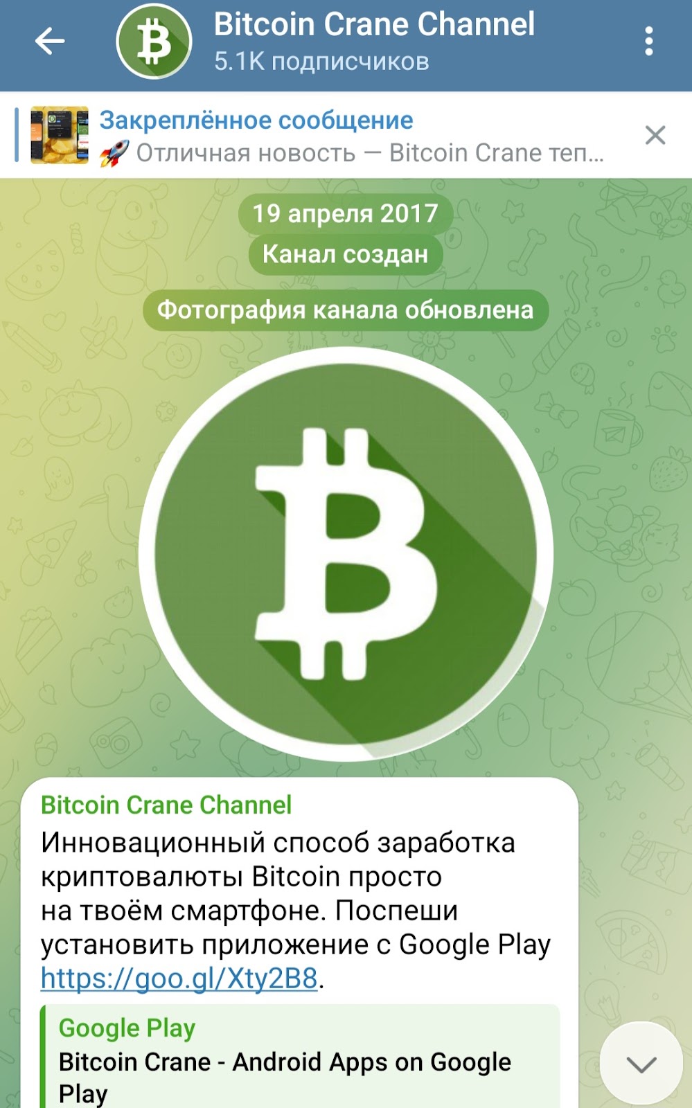 У Биткойн кран есть тг канал “Bitcoin Crane Channel”. Он ведется с 19 апреля 2017 года. В нем публикуются новости криптовалюты и блокчейн индустрии, ведется реклама бота по заработку сатоши.