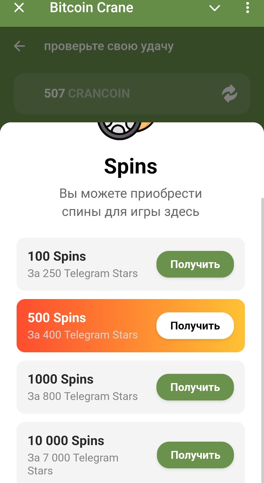 Тем, которые хотят продолжить крутить барабан и получать вознаграждения, предлагают купить spins. 100 spins стоят 250, 1000 spins — 800, а 10000 spins — 7000 телеграмм-звезд.
