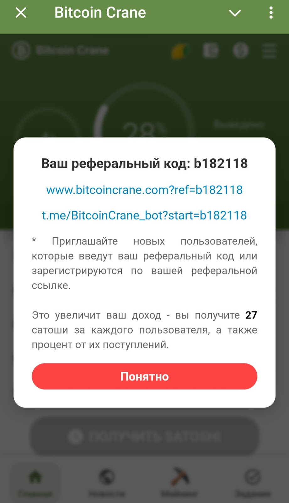 За это время можно заработать сатоши другими способами, например, приглашая рефералов. За каждого нового привлеченного пользователя обещают начислять 27 сатоши. Реферальную ссылку можно получить в разделе личного кабинета “Реферальный код”.