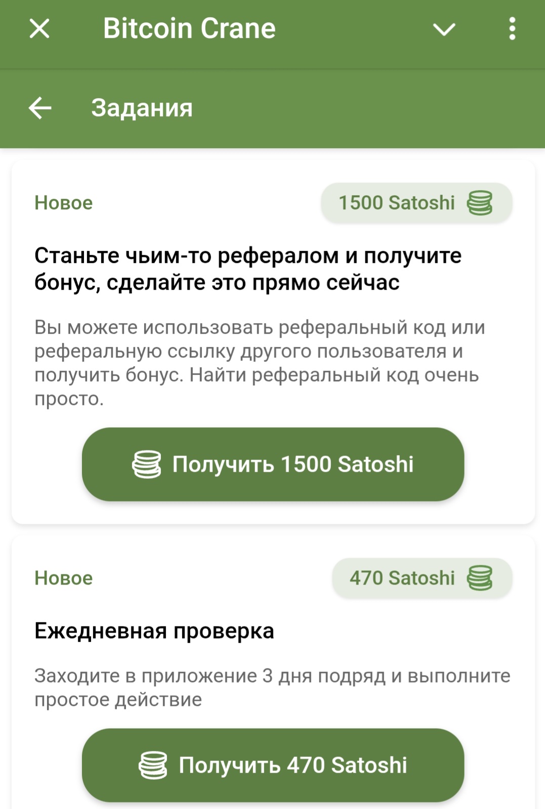 Можно зарабатывать дополнительные сатоши и в разделе Задания. Например, за добавление приложения Bitcoin Crane начисляют 25 сатоши, а став чьим-то рефералом можно получить сразу 1500 сатоши. Если заходить в приложение 3 дня подряд, обещают дать 470 сатоши.