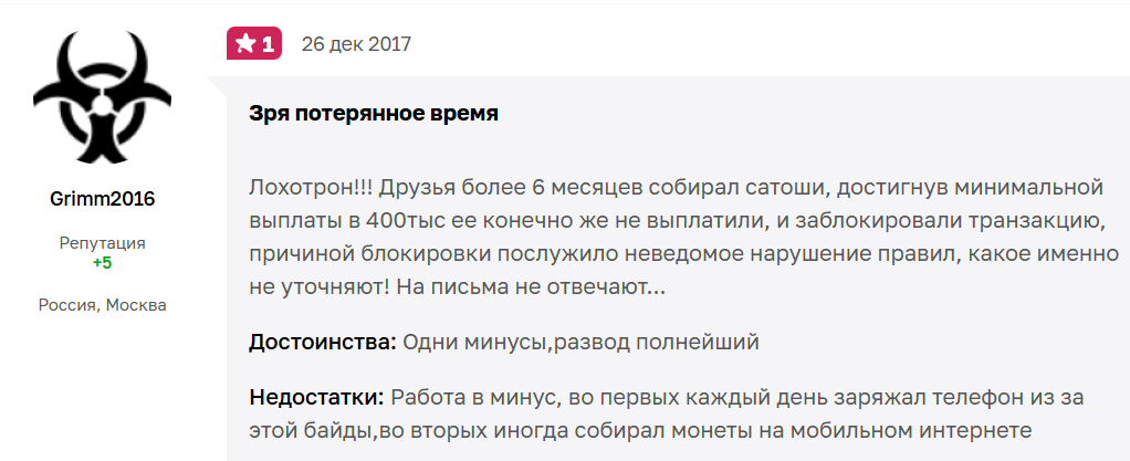 Биткоин Кран представляют как приложение, которое дает уникальную возможность получать сатоши за выполнение простых заданий. В ходе его анализа было установлено, что многие пользователи сталкиваются с невозможностью вывода накопленных средств. Также были обнаружены и другие признаки, характерные для скам-проектов: