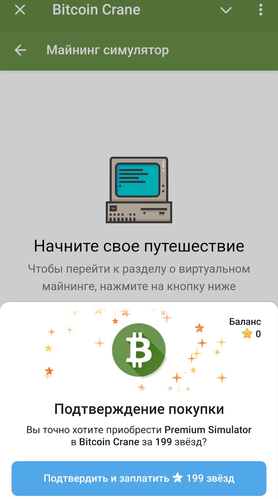 Также доступен виртуальный майнинг. Доступ к нему стоит 199 телеграмм-звезд. Скорость добычи сатоши не уточняется и в целом условия по майнингу не расписаны.