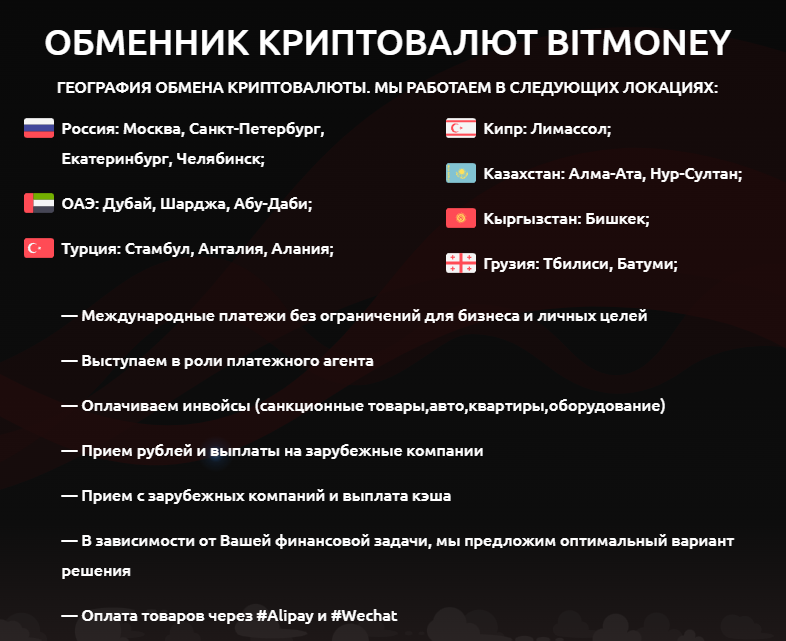 Клиентам «БитМани Екб» доступны международные платежи, оплата инвойсов, товаров через WeChat или AliPay.