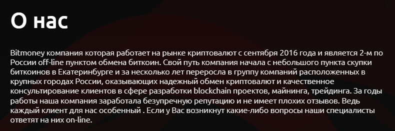 Команда «БитМаниГрупп» не раскрывает себя, из-за чего пользователи не могут убедиться в их надежности. В разделе «О нас» администрация пишет, что начала работать с сентября 2016 года. Она же утверждает, что платформа входит в Топ-2 лучших offline-пунктов для обмена криптовалют.
