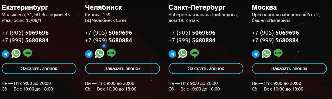 Закрытость подобной информации не дает потенциальным клиентам оценить для себя преимущества и недостатки сотрудничества. Возможно, узнать больше можно по номерам горячей линии техподдержки +7 905 506-96-96 в Екатеринбурге. На сайте есть контактная информация и график работы offline-обменников в других городах.