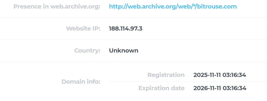 Bitrouse – это платформа, домен которой был зарегистрирован 11 ноября 2025 года. Данные о владельце адреса скрыты. Сервис управляется структурой под названием BitRouse Group – операционным оператором которой выступает компания BitRouse Technologies Limited. Организация зарегистрирована в Республике Панама.