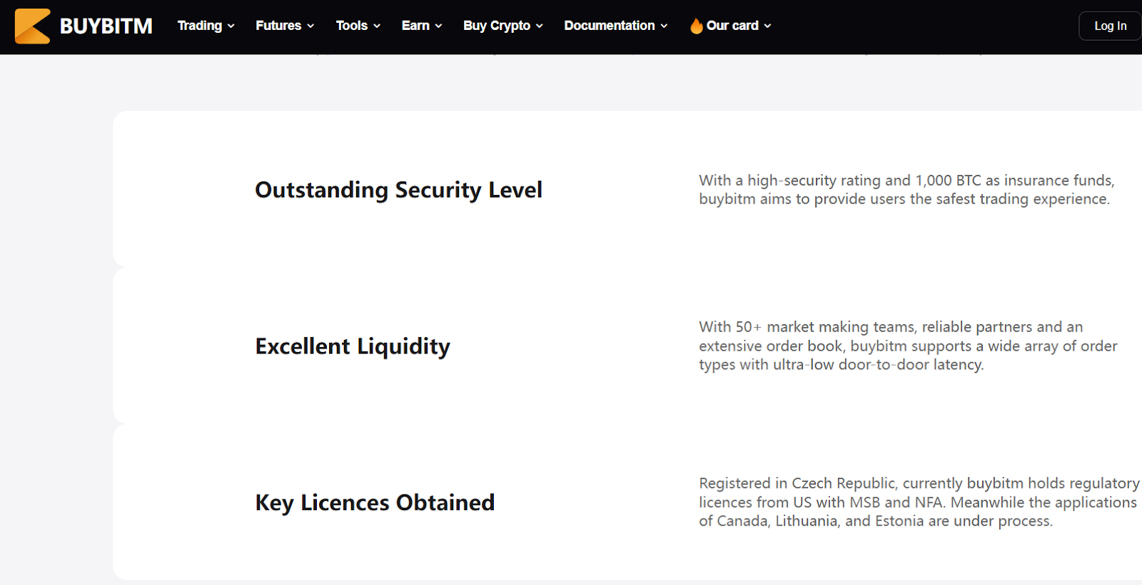 Помимо этого, создатели биржи утверждают, что имеют лицензию в Чешской республике и США, но ссылок на документы нет, а так как официальное название организации неизвестно, проверить ничего нельзя. В одном из разделов написано про возможность оформления криптовалютной карты, но при входе просто указано «скоро», поэтому в январе 2026 года заказать ее нельзя.