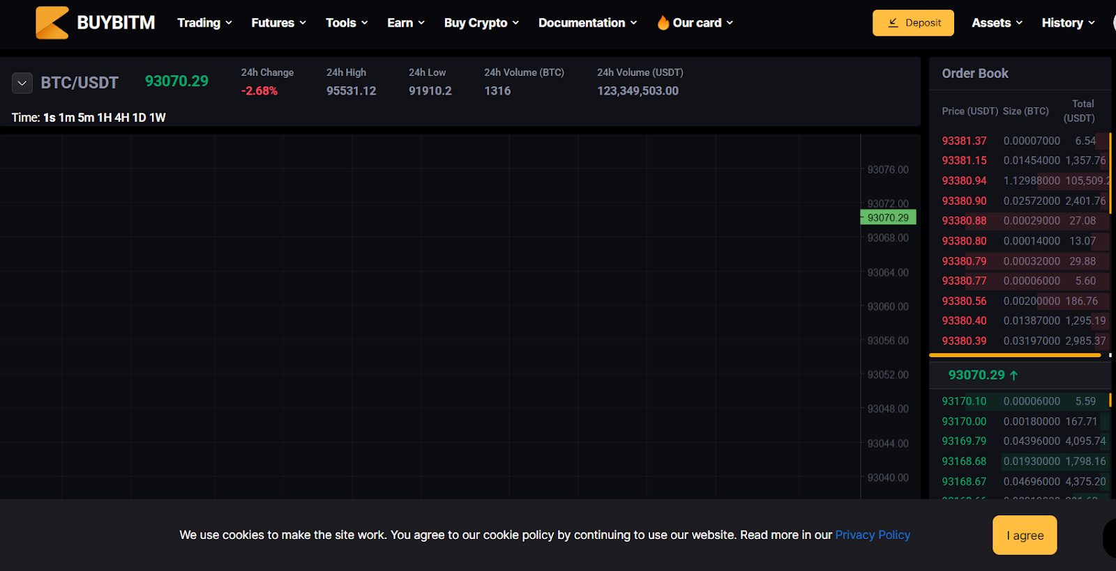 В личном кабинете многие разделы недоступны, так как для доступа к ним нужно пройти верификацию, но спотовый терминал изучить можно, хотя здесь особо ничего и нет. Есть график и возможность изменить таймфрейм, а также книга ордеров, но при любых изменениях свечи пропадают.