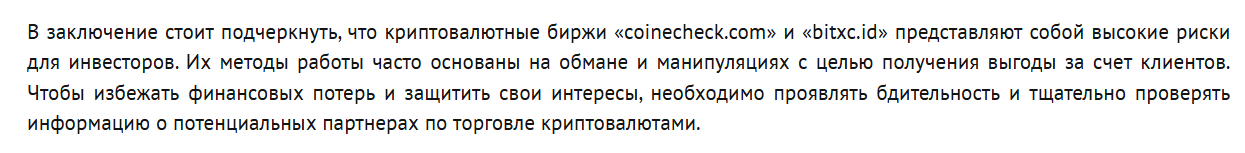 - Полное отсутствие проверяемых данных о юридическом лице и лицензиях не позволяет установить ответственных за деятельность площадки, что лишает пользователей BitXc id какой-либо правовой защиты в случае возникновения споров.