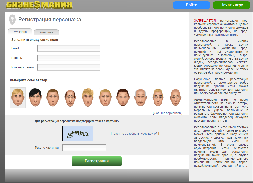 Регистрация учетной записи в игре «Бизнес Мания»