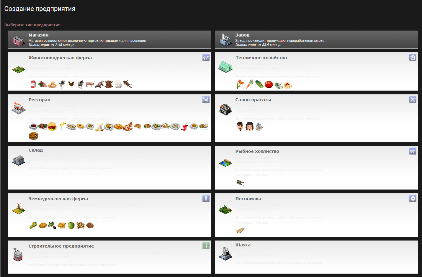 Основная цель игры, как заявляют организаторы — развитие виртуальных предприятий. Пользователь может открыть такие виды бизнесов:
