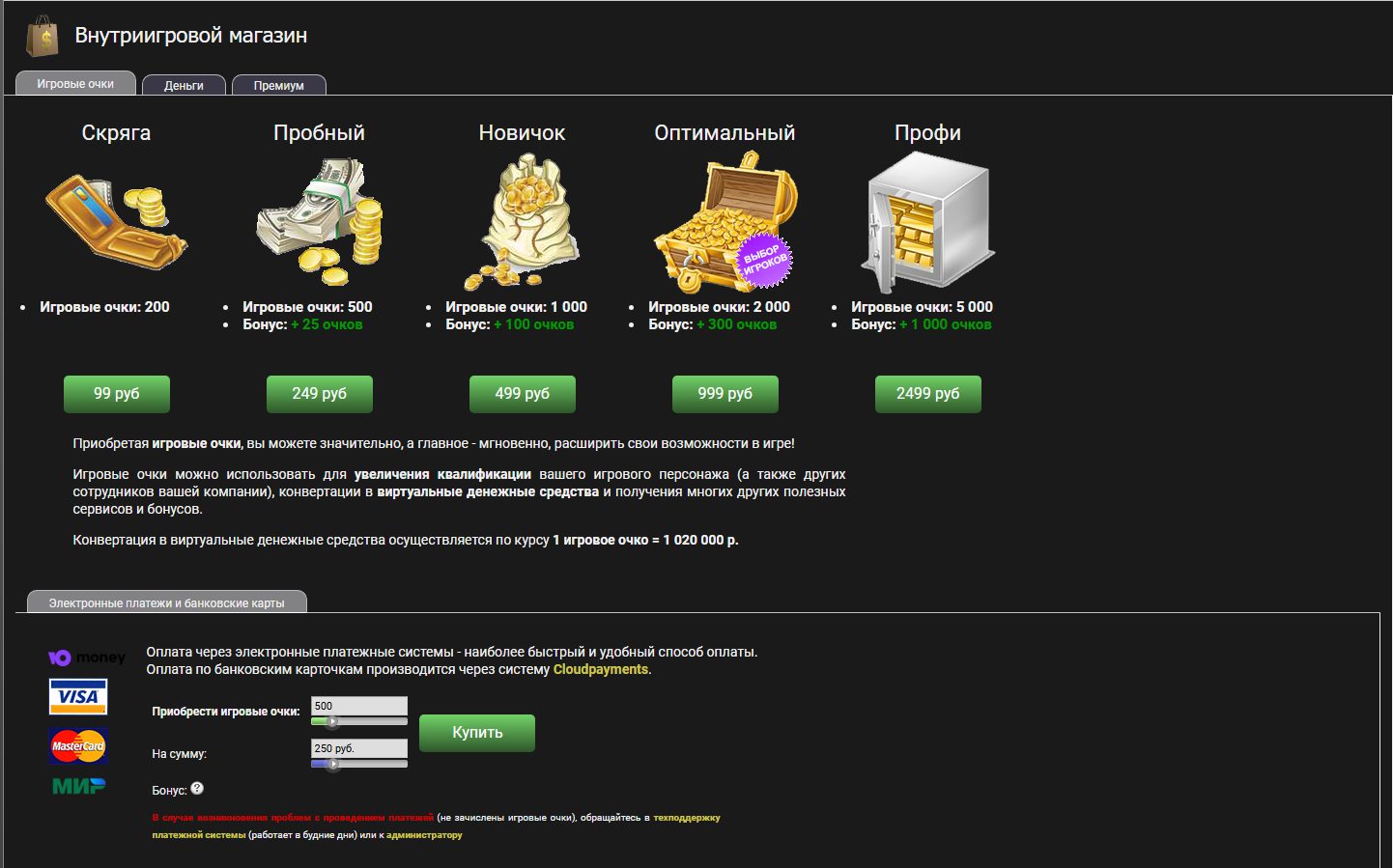 • Конвертировать в виртуальные деньги по курсу 1 очко = 1 020 000 внутриигровых рублей.