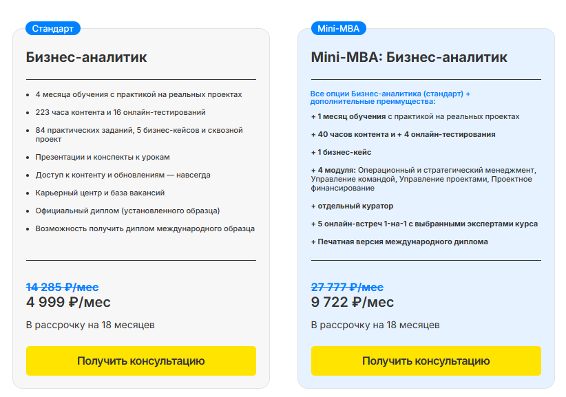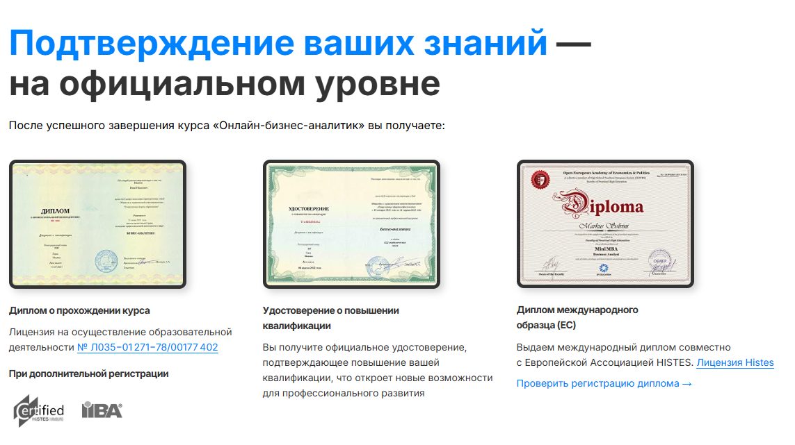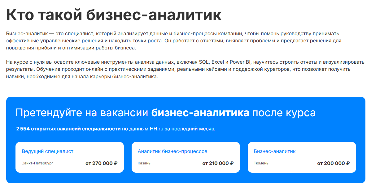 Далее кратко раскрывается то, кем вообще является бизнес-аналитик. И хоть здесь же приводят немалые заработные платы, на самом деле они не соответствуют действительности. Например, в Санкт-Петербурге специалисты якобы получают от 270 тыс. рублей, хотя мы обнаружили немало вакансий, где платят чуть ли не в два раза меньше. Кроме того, стоит учитывать, что почти все работодатели в качестве требуемого опыта указывают 3-6 лет. Конечно, этого после прохождения курса у человека не будет.