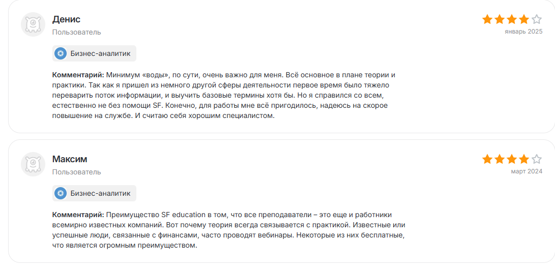 В целом отзывы о курсе Бизнес аналитик от SF Education неплохие. Люди пишут, что в содержании минимум “воды”, а преподаватели и правда делятся знаниями. полезными в практике. Однако данные комментарии могут быть и рекламными. Негативные же оценки мы не обнаружили.