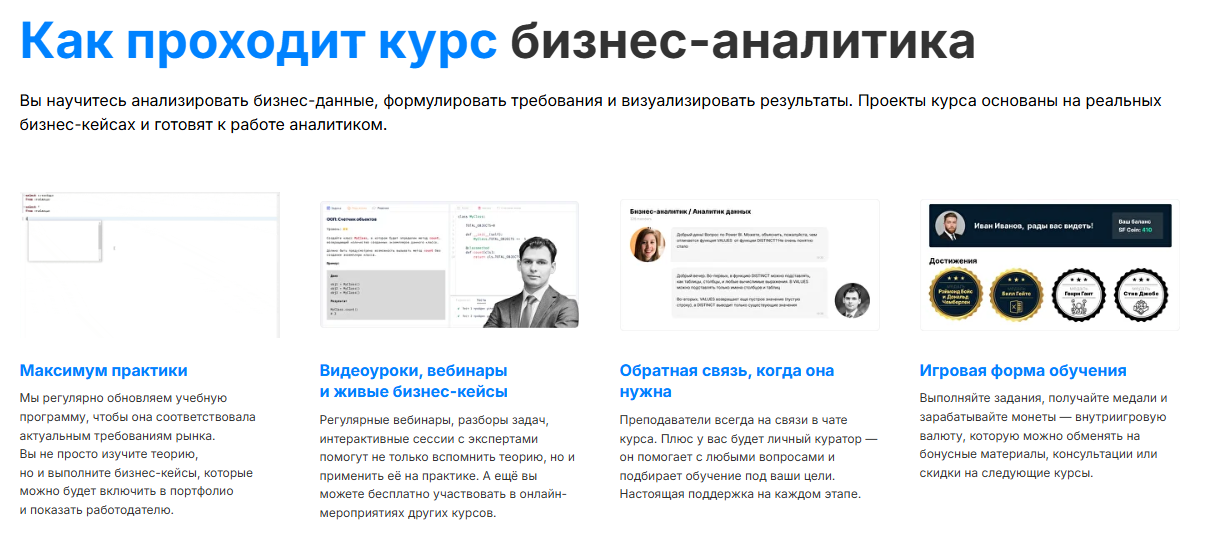 Пользователь также может узнать о форматах, которые ждут его в рамках обучения: среди них, например, видеоуроки, вебинары, общение с кураторами и т.п. При этом довольно важные детали вроде общей длительности курса почему-то не озвучены.