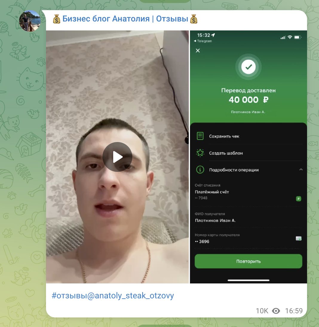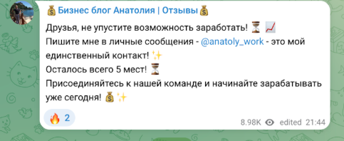 Вокруг имени Анатолия выстроена сеть связанных каналов и чатов. Названия и оформления меняются, но его имя всегда фигурирует в названии, например Scocov Dengg или «Бизнес Блог Анатолия». Такой формат позволяет собирать трафик из разных ниш, переводить аудиторию между проектами и усложнять внешнюю оценку реальных результатов. Почти в каждом канале присутствует одна и та же схема: общие обещания в постах, а конкретика только в личке.