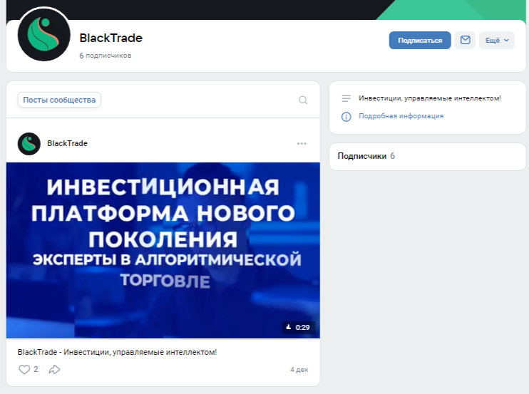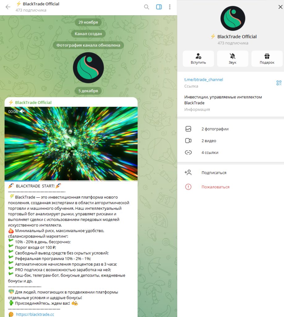 В телеграм-канале BlackTrade Official в первой публикации указывается, что «БлекТрейд» – это инвестиционная платформа нового поколения, созданная экспертами в области алгоритмической торговли и машинного обучения. Авторский бот анализирует рынки, управляет рисками и выполняет сделки с использованием передовых моделей искусственного интеллекта.