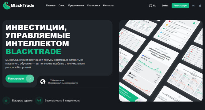 В интернете есть несколько статей о работе источника «БлекТрейд» https blacktrade cc, но без отзывов. В одной был расположен только скриншот главной страницы ресурса. Здесь рассказывается, что проект занимается инвестициями и управляется специальным интеллектом.