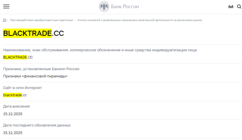 В одной из статей был скриншот платформы, но о его содержании мы расскажем позже. Также мы обнаружили, что проект засветился на сайте ЦБ РФ. 15 декабря 2025 года он попал в черный список с признаками финансовой пирамиды.