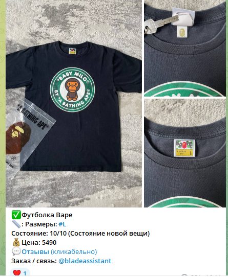 Контент Блейд Маркета в ТГ состоит из карточек товаров с указанием бренда, размера, состояния и цены. В публикациях используется отметка наличия. Для навигации по ленте применяются хэштеги по типу вещи и бренду, например #Футболка и #Bape. В ассортименте фигурируют популярные премиальные бренды и позиции уличной моды.