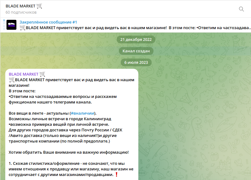 Blade Market – Telegram-магазин с якобы брендовыми вещами и услугой доставки «под заказ». Продажи в нем построены на доверии к менеджеру и заявлению об «оригинальности» без каких-либо объективных подтверждений.