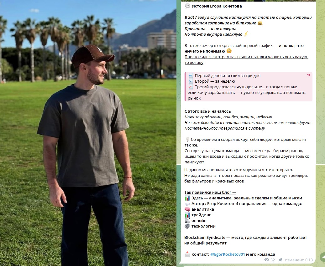 Публикации просматривает около 11%, негативные реакции и комментарии заблокированы. Автор и лицо проекта — Егор Кочетов, Telegram-аккаунт @EgorKochetov01. В своих публикациях он описывает стандартную для инфотрейдинга “историю становления”: первый интерес к криптовалюте в 2017 году, отсутствие понимания рынка на старте, несколько слитых депозитов и постепенный переход от “угадывания” к якобы системной торговле.
