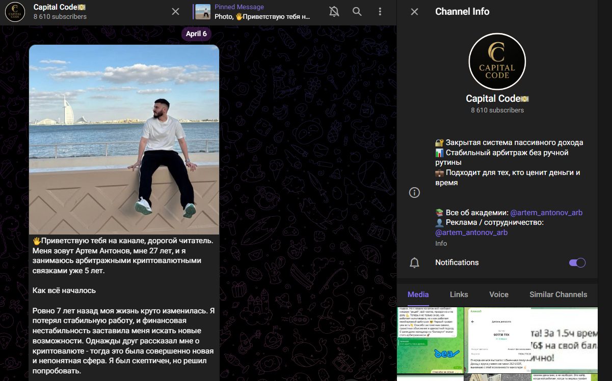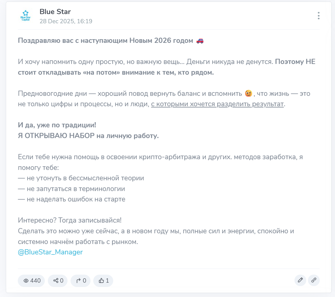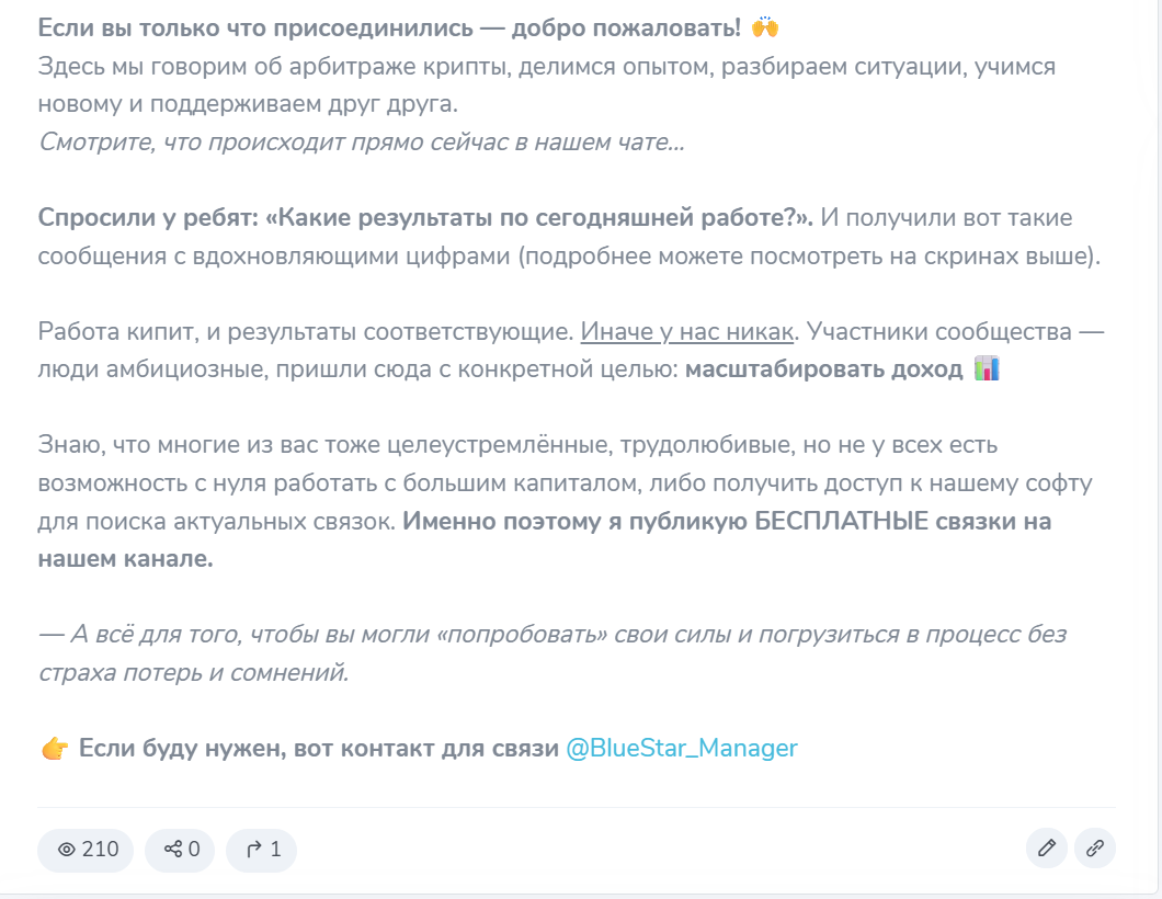 Канал Blue Star Capital появился в мае 2024, сколько он успел сменить названий, не ясно, однако контент не удалялся. Аудитория сообщества составляет 8,5 тысячи человек, это боты, что можно увидеть из охватов — посты читает от силы 5%. Комментирование отключено, реакций на публикациях почти нет. Автора зовут Артем, он рассказывает, что в 20 лет столкнулся с финансовыми проблемами, для их решения пробовал себя в трейдинге, но нервные сделки оказались не для него. Арбитраж же стал тем самым стабильным источником дохода и уже пять лет дает высокую прибыль. Как уверяет трейдер, с нуля можно зарабатывать не менее 3 тысяч баксов ежемесячно, для этого даже не нужно иметь большого депозита. Вся информация в канале доступна бесплатно, закрытое сообщество тоже не требует оплаты, но дает больше полезных сведений и готовые связки для арбитража.