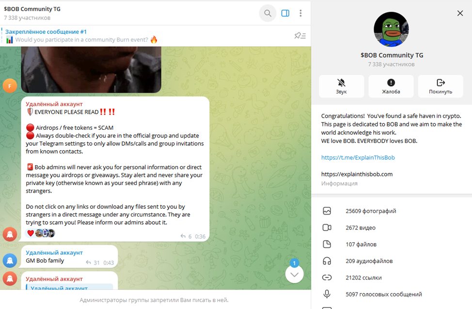 В Телеграме крипта BOB представлена чатом @ ExplainThisBob. 7,3 тыс. подписчиков не проявляют особой активности. В основном пользователи видят сообщения о покупке токенов новыми инвесторами.