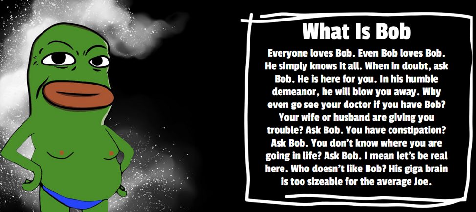 • Для привлечения внимания к проекту в качестве бренда был выбран мультяшный персонаж BOB, внешне сильно напоминающий $PEPE;