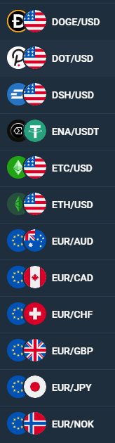 Для торговли доступны около 100 активов, среди которых валюты, криптовалюты, акции известных компаний и индексы. Такой широкий выбор — несомненный плюс данной биржи.