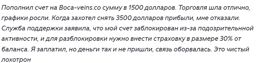 Один из клиентов в своем отзыве о Boca Veins Co рассказывает, что пополнил счет на $1,5 тыс. Платформа показывала прибыль $3,5 тыс., но вывести ее не получилось. Мошенники заблокировали пользователю счет и потребовали «страховку» в размере 30% от баланса, а затем перестали выходить на связь.