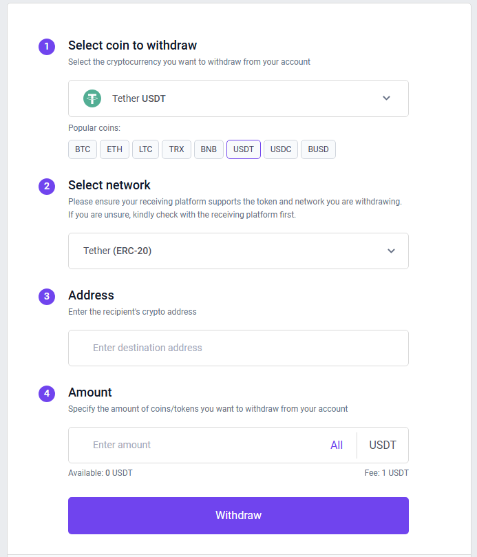 Вывод доступен в USDT, ETH, LTC, TRX, BNB, USDC, BUSD. Минимальная сумма не указана, комиссия — эквивалент 1 USDT за транзакцию. Заявку обещают обработать в течение 24 часов, однако на практике возникают задержки или ее вовсе отклоняют.