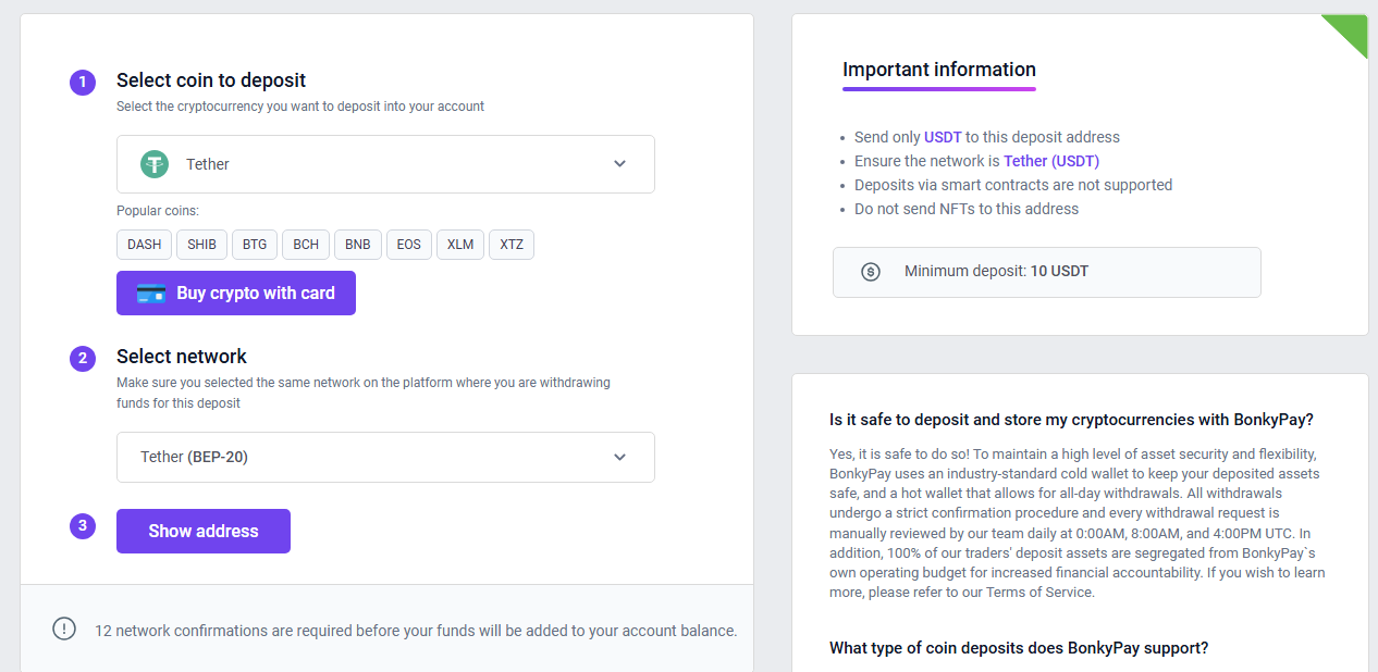 Депозит пополняют почти в любой криптовалюте: перечислены десятки монет. Минимальная сумма — эквивалент 10 USDT, при этом банковские карты и электронные кошельки не работают, что также вызывает сомнение в надежности организации.