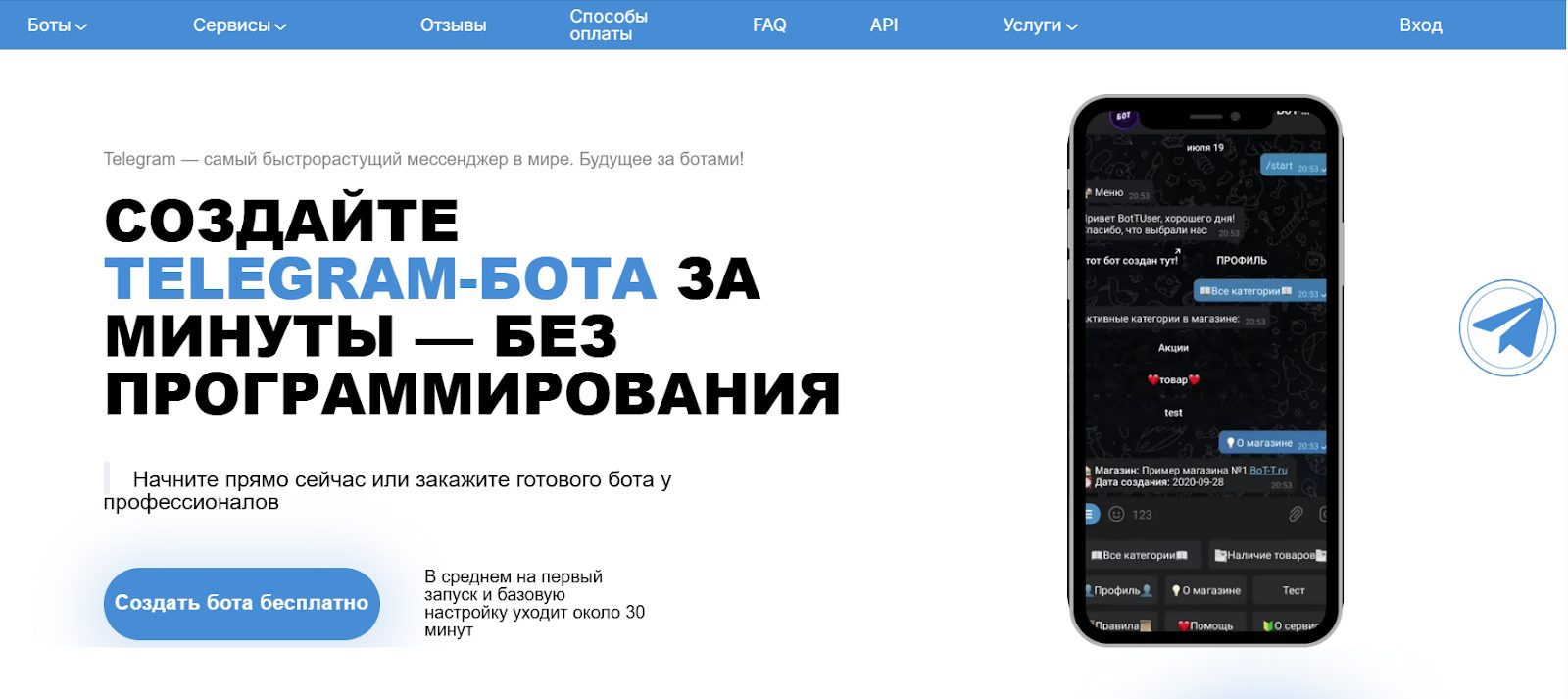 - бесплатная версия. Подходит для того, чтобы ознакомиться с сервисом и посмотреть, как он работает, создать пробные версии ботов без необходимости продажи товаров и подключения способов оплаты;