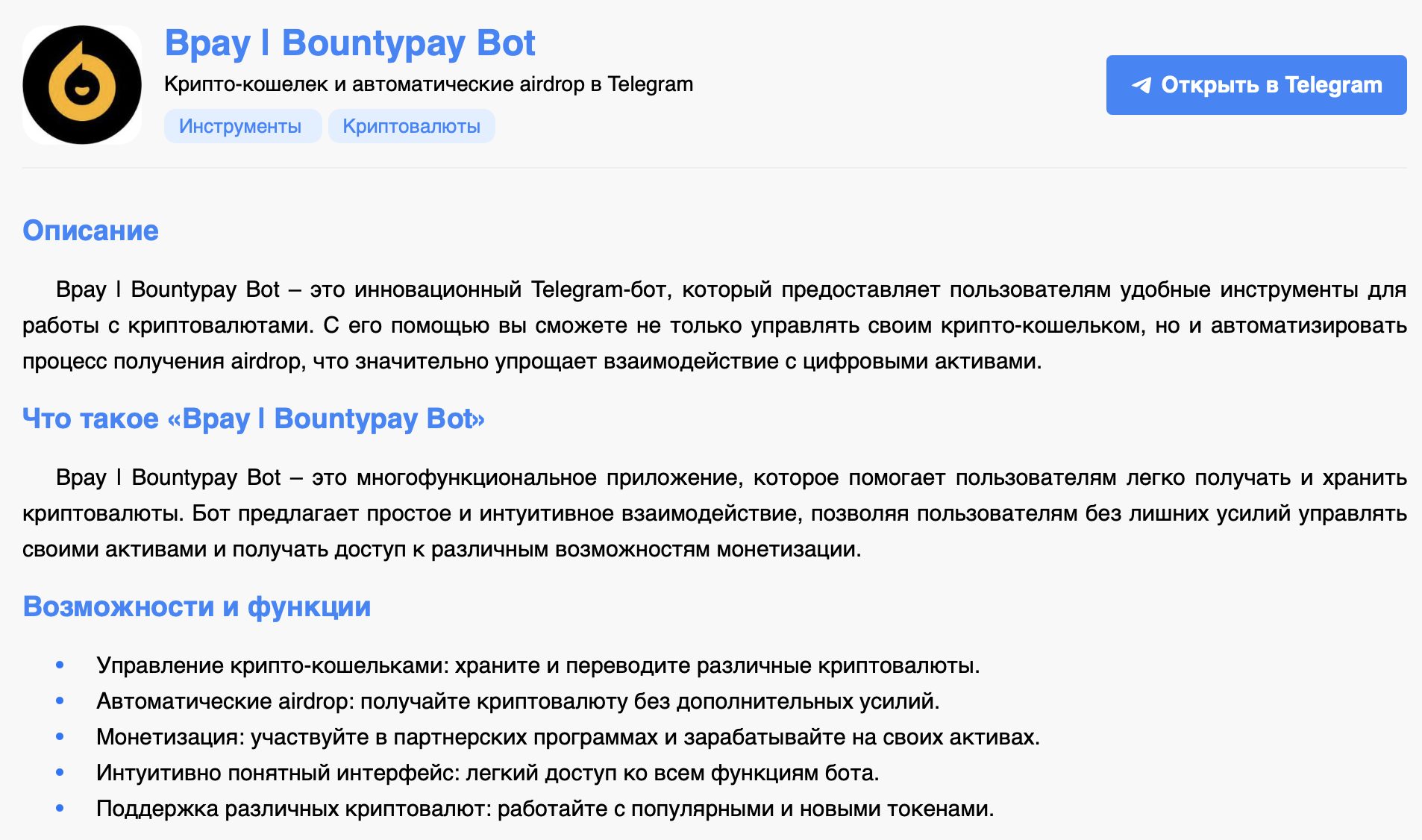 Bpay Bountypay Bot — это Telegram-мини-приложение, которое совмещает в себе крипто-кошелек и систему автоматического фарминга airdrop’ов. По словам создателей, бот помогает пользователям легко управлять активами, получать бесплатные токены от новых проектов и участвовать в партнерских программах.