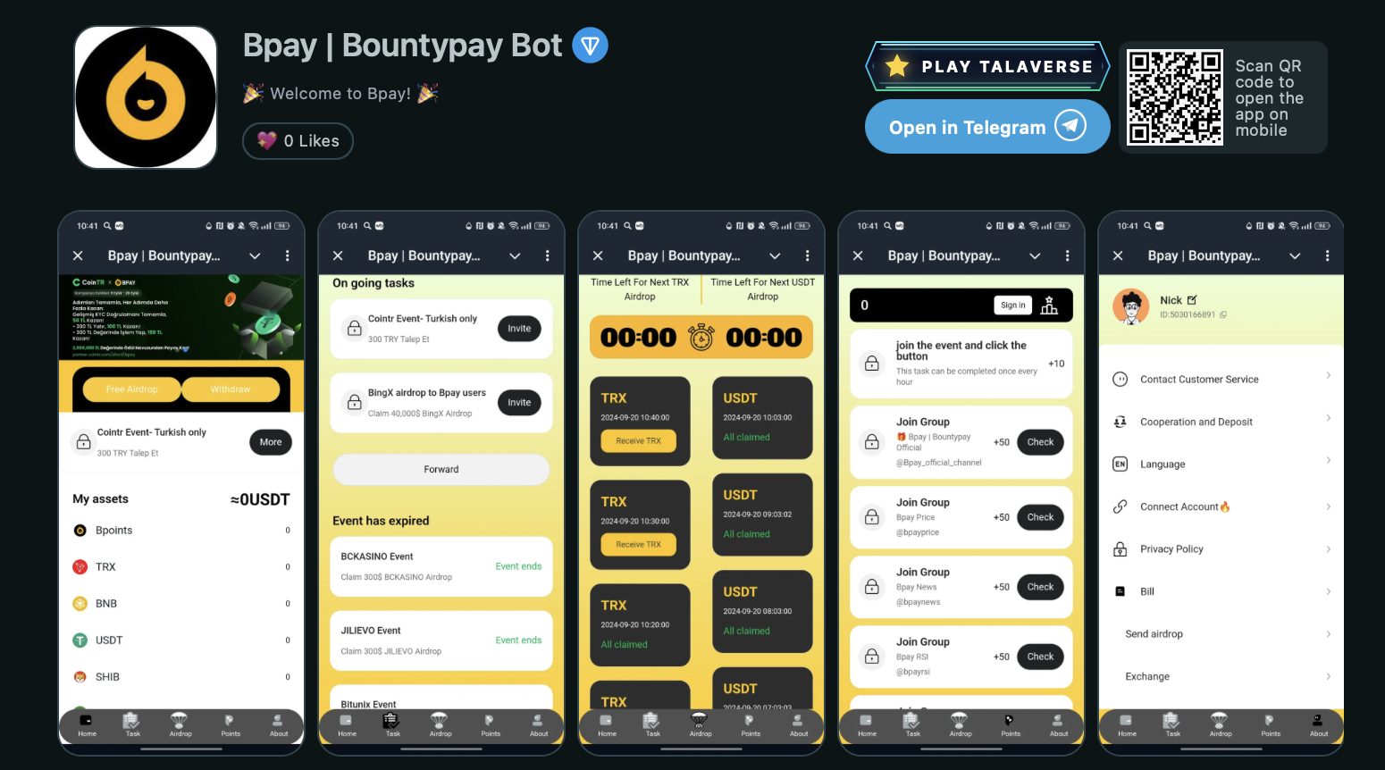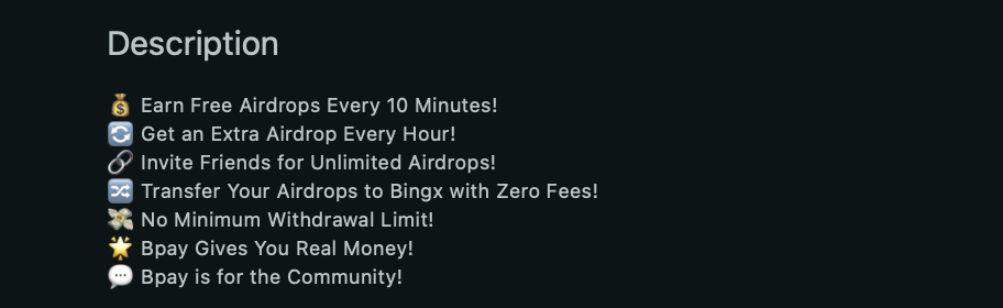 Bpay Bountypay — это Telegram-бот и криптовалютный кошелек с автоматической системой «аирдропов». Разработчики обещают бесплатные дропы каждые 10 минут, дополнительные награды активным пользователям, а также вознаграждения по реферальной системе. Вдобавок заявлен быстрый вывод средства возможность без комиссий на платформу BingX.