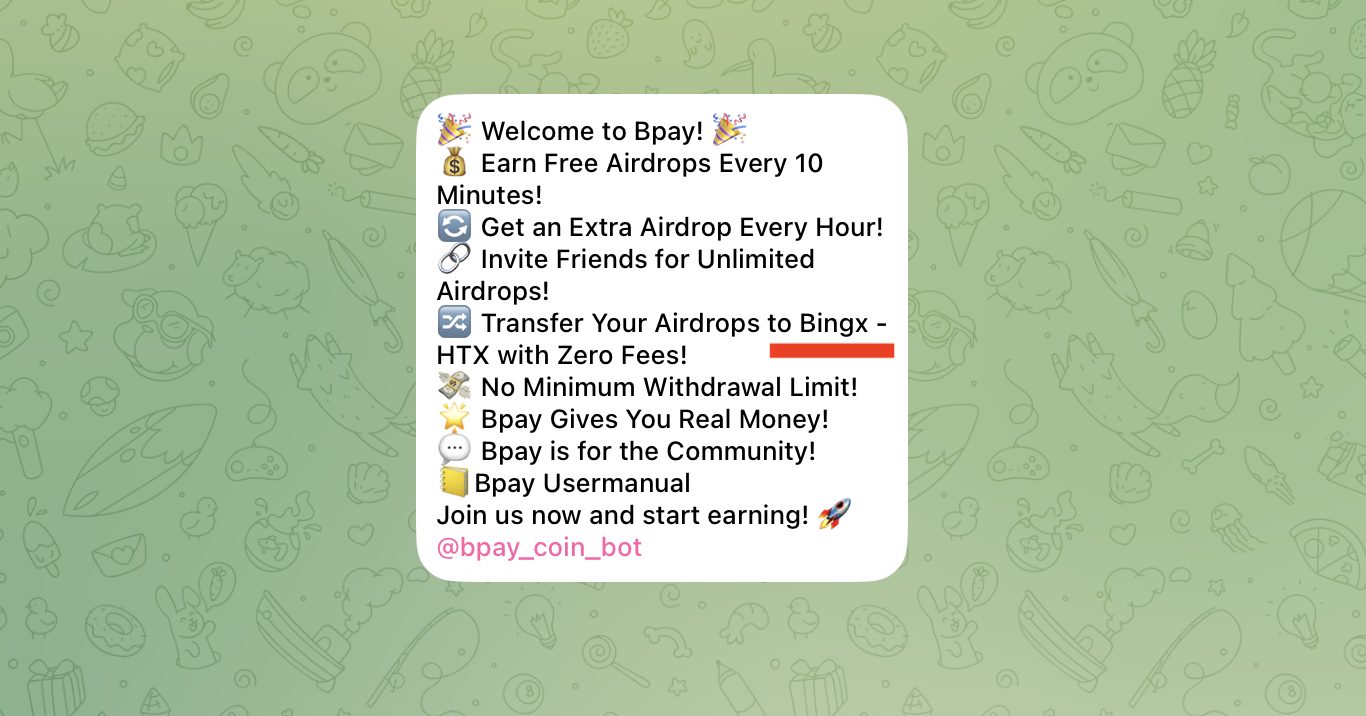 Заработок в Bpay построен вокруг автоматических airdrop’ов. По условиям, каждые 10 минут пользователь может получить бесплатный дроп, каждый час — дополнительный. Приглашение друзей дает неограниченное количество наград. Есть задачи по участию в партнерских программах, мониторингу курсов и хранению активов. Переводы из Bpay coin bot на BingX якобы возможны без комиссий, а вывод без минимального порога.