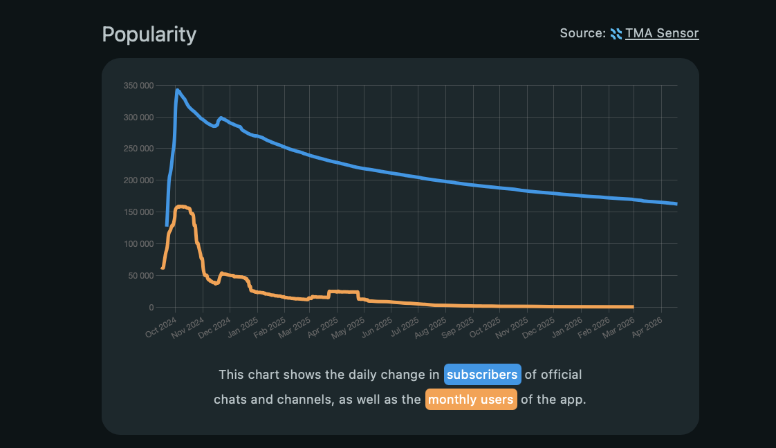 По статистике популярность бота резко выросла осенью 2024 года, дойдя до 340 тысяч активных пользователей. Далее последовал заметный спад, который продолжается по сей день. По состоянию на апрель 2026 года месячная аудитория бота Bpay держится на отметке в 170 тысяч юзеров, но все еще идет вниз.