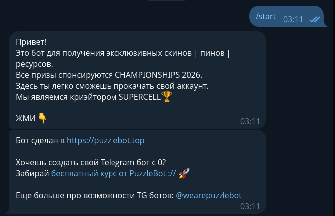 Создатели бота обещают щедрый дроп и эксклюзивные скины якобы от самой компании Supercell — разработчика культовой игры Brawl Stars. Однако по факту вместо обещанных подарков второе сообщение в боте выдает ссылки на платформу PuzzleBot. Подробнее об этом проекте — в нашем обзоре.