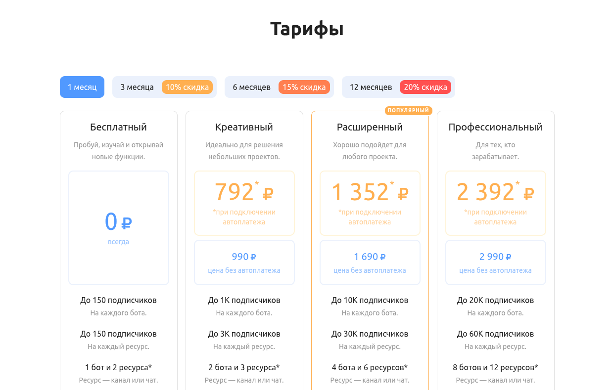 Монетизация платформы работает по классической модели подписки — есть несколько грейдов в зависимости от масштабов вашего бизнеса. Стартовать можно с бесплатного тарифа, его функционала вполне хватит для тестирования гипотез или запуска визитки.