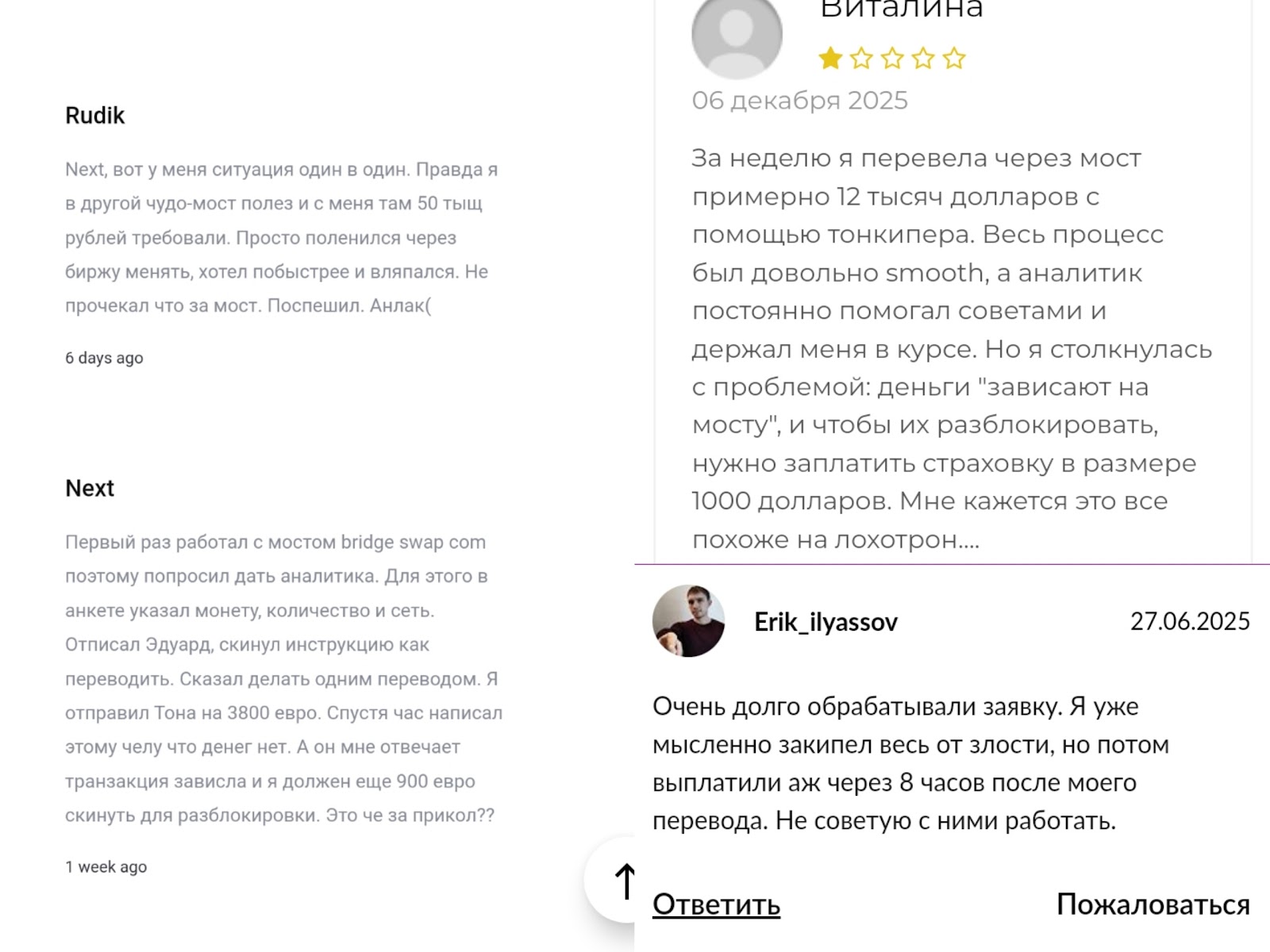 Сейчас нельзя узнать, размещались ли высказывания клиентов на сайте. В сети есть отзывы о том, что переводы на платформе Bridge Swap com долгие, и средства могут заблокировать, а для разблокировки требуют вносить платежи.