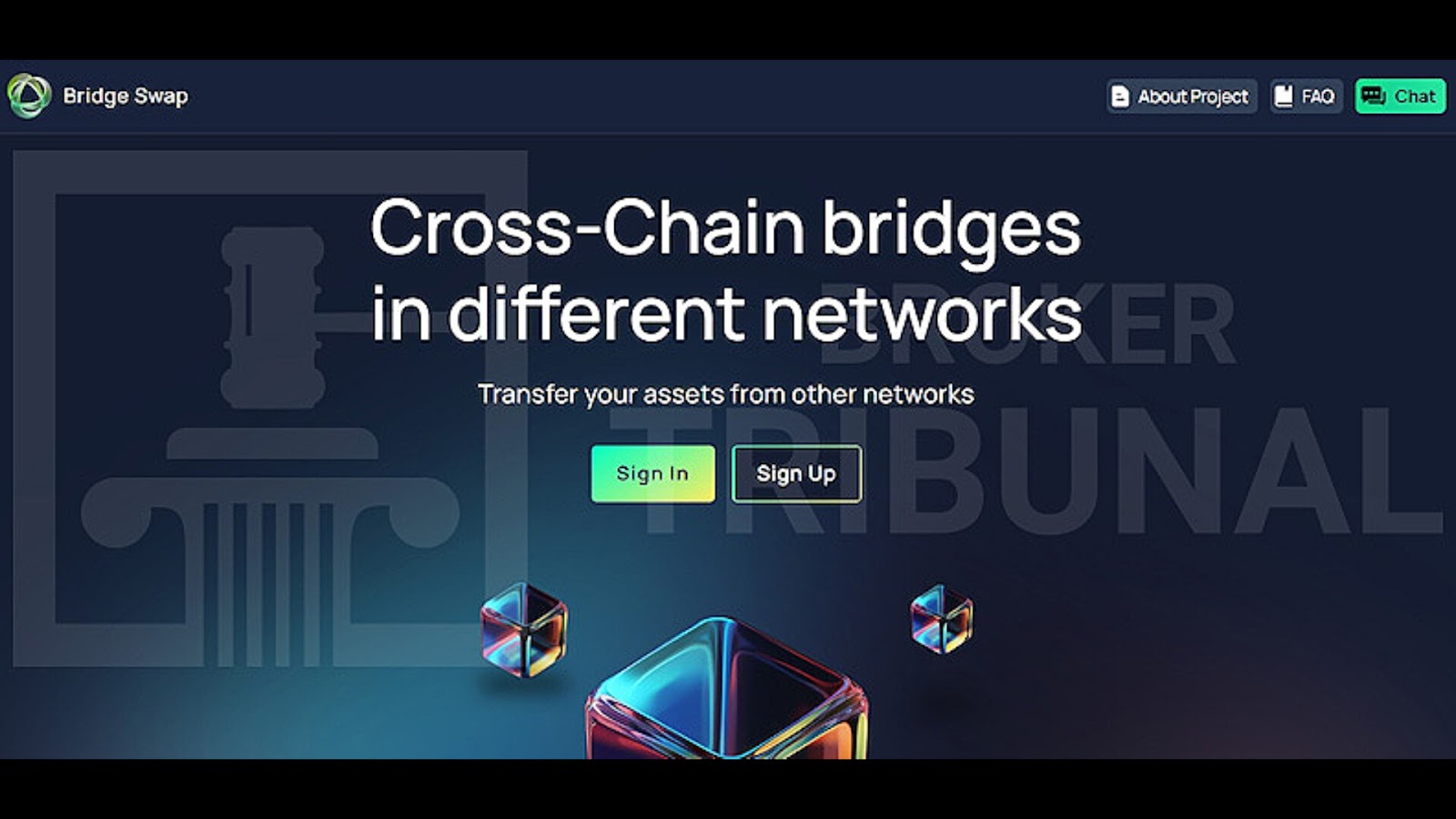 Раньше проект предлагал услуги через веб-площадку bridge swap com, но сейчас она недоступна. Из информации в сети, сайт предоставлялся на английском языке. Из категорий были: “О проекте”, “Вопросы”, “Чат”. Отдельно предлагались разделы со входом и регистрацией на ресурсе.