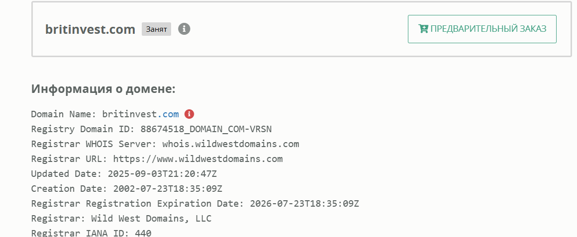 На веб-ресурсе не указана дата основания компании Britinvest. Домен сайта зарегистрирован в 2002 году, а обновился в 2025-м.