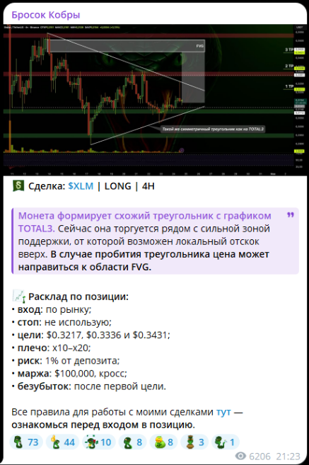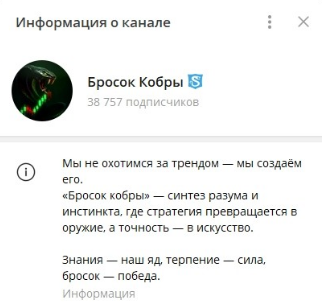 Владелец проекта представляется успешным экспертом по криптоинвестициям и намекает на наличие высокого уровня профессиональной квалификации. На телеграм-платформе «Бросок кобры» investor демонстрирует публике данные об эффективных методах, позволяющих быстро увеличивать прибыль. Сам создатель контента обещает, что профит в сделках на бирже благодаря применению предлагаемой в сообществе информации на практике не заставит себя ждать. Контент настоящий криптомастер тщательно подготавливает и выкладывает действительно рабочие системы заработка.
