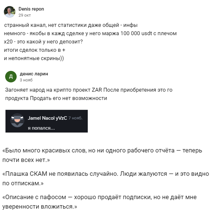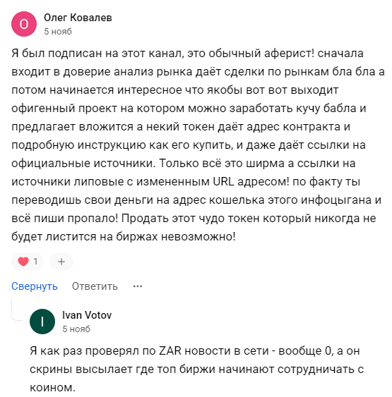 Купил по рекомендации этого скамера для себя монету. Но это просто пустышка, которую не продать. Иллюзия. Не более. А он сидит на прибыли там. И продолжает обманывать народ. Хорошо, что люди жалуются и на его канале теперь красуется отметка СКАМ! Так и надо таким как админ этого ресурса