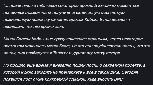 В группе Brosok Kobry финансовый гуру рекламирует цифровые активы, инвестиции в которые принесут увеличение суммы в кошельке. Он предоставляет аудитории доказательства того, что с помощью его методики можно хорошо зарабатывать. Криптоинвестор предлагает публике тг-клуба «Бросок кобры» торговые сигналы, а также приглашает в трейдинг команду. Основатель паблика намекает, что заслужил в trade комьюнити положительную репутацию, и его рекомендациям можно доверять. Трейдер предлагает копировать его сделки и зарабатывать на этом. Но конкретные условия сотрудничества на сервисе в открытом виде не опубликованы. Для уточнения регламента взаимодействия с профессиональным crypto торговцем нужно писать администратору клуба в ЛС. После появления в шапке сообщества плашки SCAM народ начал активно отписываться от подозрительного канала и впечатление о trading площадке у юзеров начало меняться в отрицательную сторону.