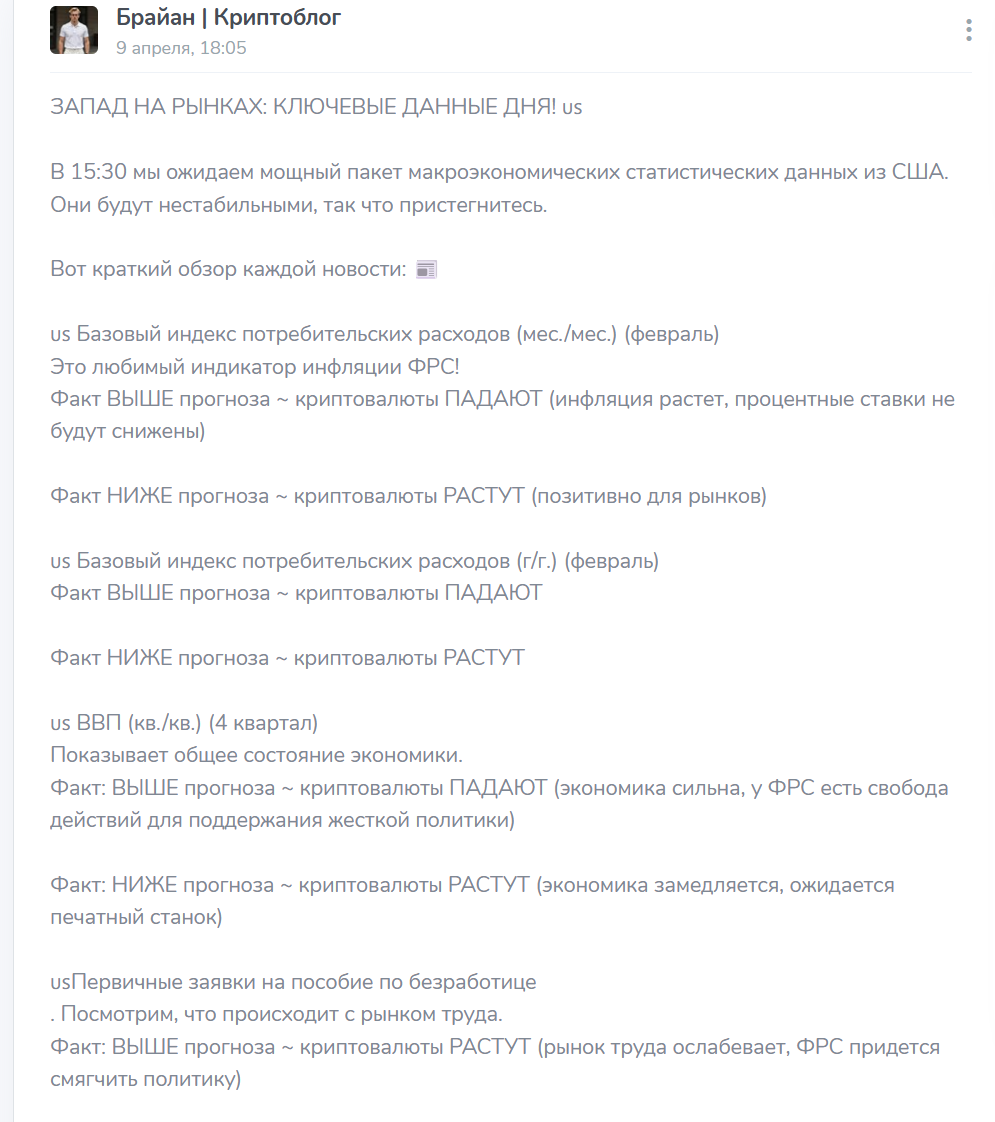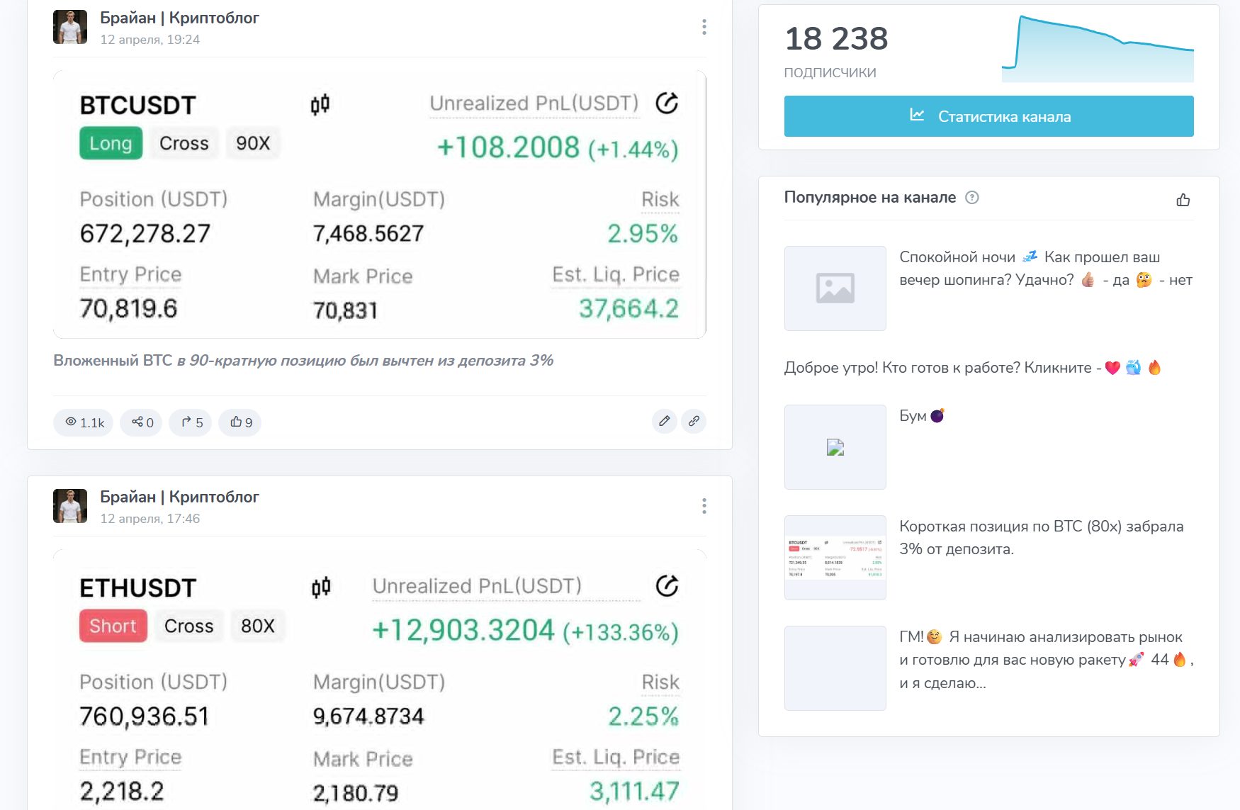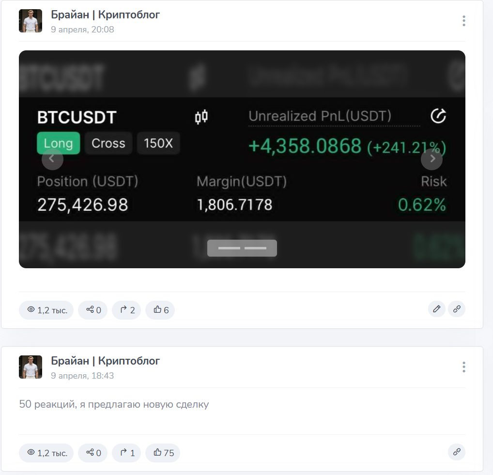 Телеграмм канал Брайан Крипто блог появился в марте 2025, за год работы на него подписалось свыше 18 тысяч человек. Посты просматривает около 10% аудитории, комментирование открыто, но сообщения появляются редко. Складывается впечатление, что сообщество накручено ботами, а реальных подписчиков в нем единицы. О себе трейдер пишет мало, с первых постов стал давать сигналы для торговли на криптовалютных биржах, а также публикует обзоры рынка, новости и обучающий контент.