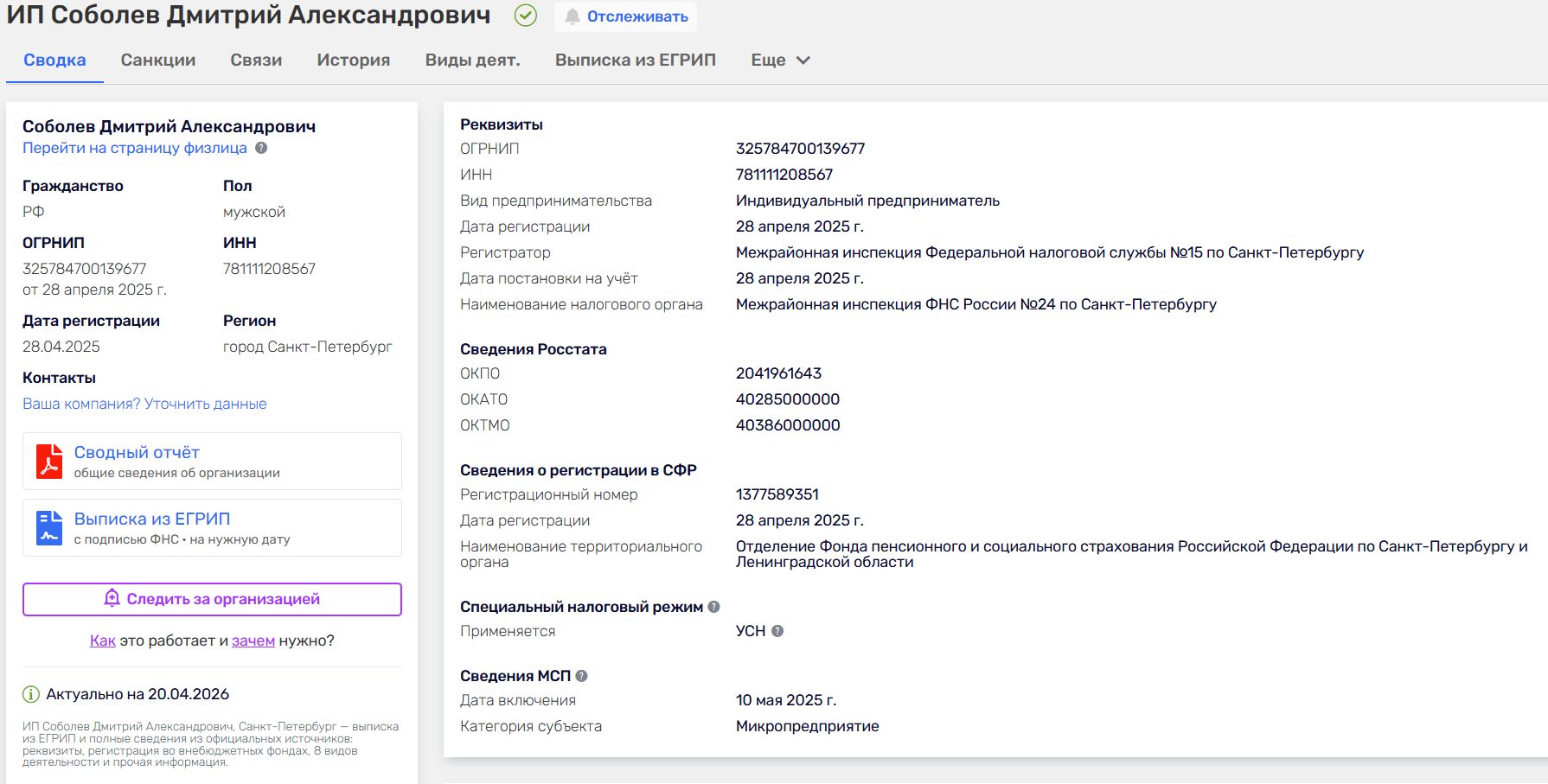 Оформление подписки на Storyninjabot проходит через ИП Соболев Дмитрий Александрович, реквизиты которого указано в соглашении. Хотим обратить внимание, что зарегистрировано оно только в апреле 2025 года, а основной вид деятельности – аренда и управление собственным или арендованным недвижимым имуществом. Выглядит это сомнительно.