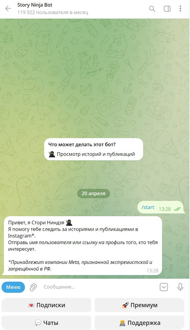 Подписка на Story ninja bot стоит 990 рублей. Сумма фиксированная, скидок и акций не предусмотрено. Абонемент оформляется прямо в боте. На 20 апреля 2026 года такой возможности нет. Временный это баг или организация перестала работать, пока не понятно.