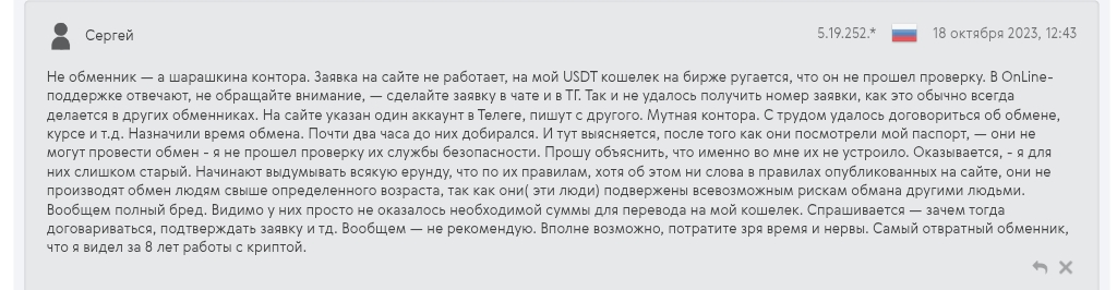 Жалобы – тоже встречаются: иногда при обмене больших сумм возникают задержки — сервис может приостановить заявку и запросить дополнительные данные или верификацию. Бывает, что из-за смены банка выплату от BTChange ru приходится ждать дольше обычного. Некоторые отмечают, что проверка личности может занять время, а новым пользователям отказывают из-за возраста.